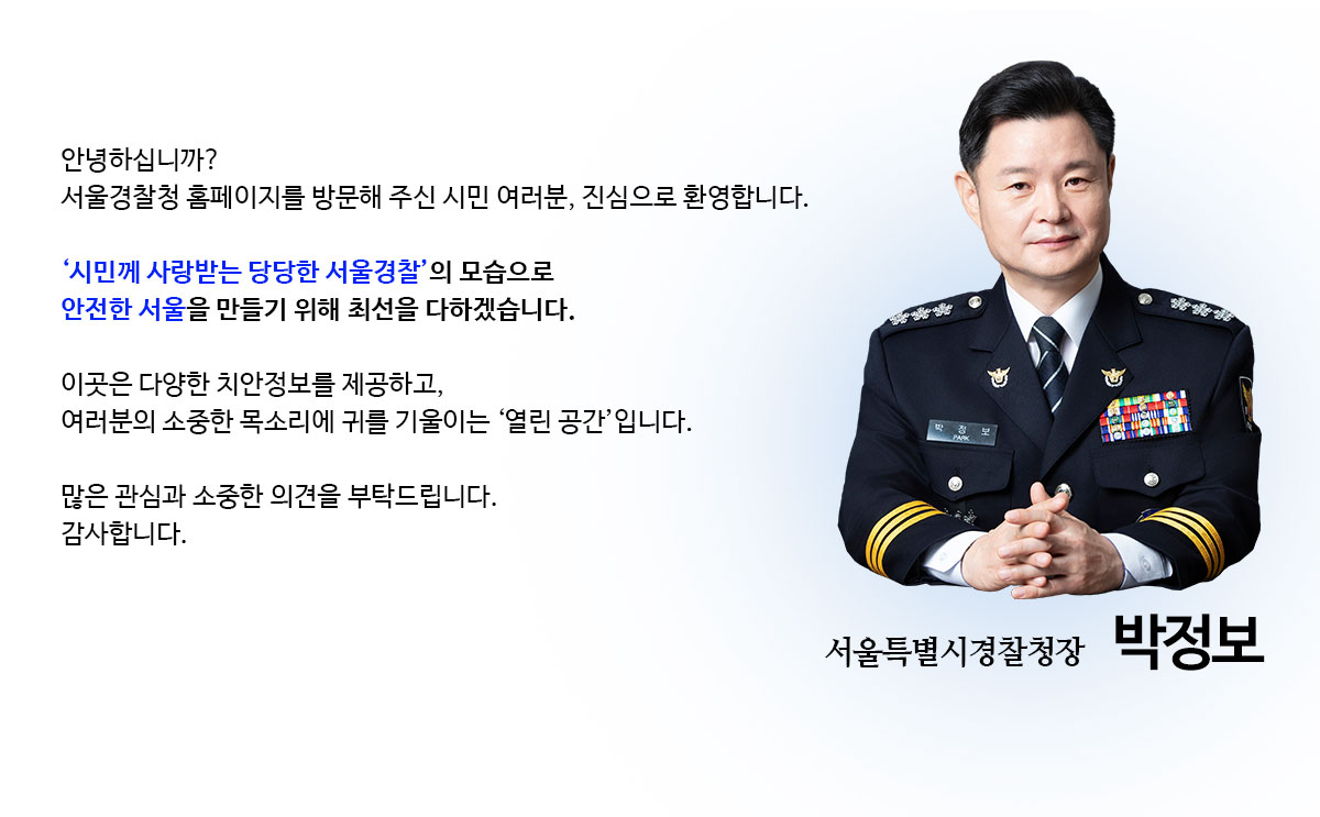 안녕하십니까? 서울경찰청 홈페이지를 방문해 주신시민 여러분, 진심으로 환영합니다. ‘시민께 사랑받는 당당한 서울경찰’의 모습으로 안전한 서울을 만들기 위해 최선을 다하겠습니다. 이곳은 다양한 치안정보를 제공하고, 여러분의 소중한 목소리에 귀를 기울이는 ‘열린 공간’입니다. 많은 관심과 소중한 의견을 부탁드립니다. 감사합니다.
