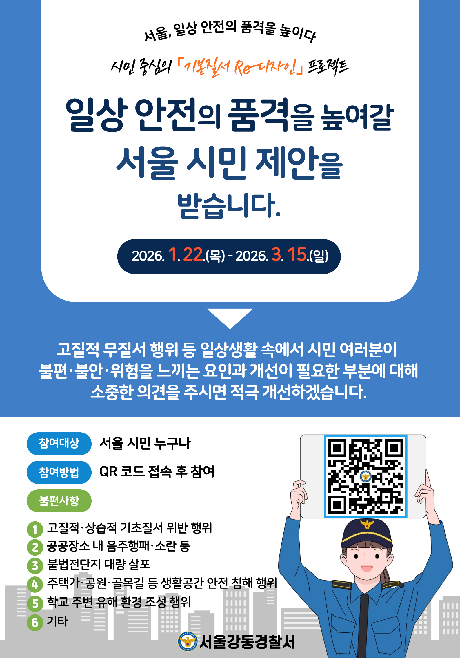 일상 안전의 품격을 높여갈 서울 시민 제안을 받습니다. 2026.2.1.(일) ~ 2026.3.15.(일)