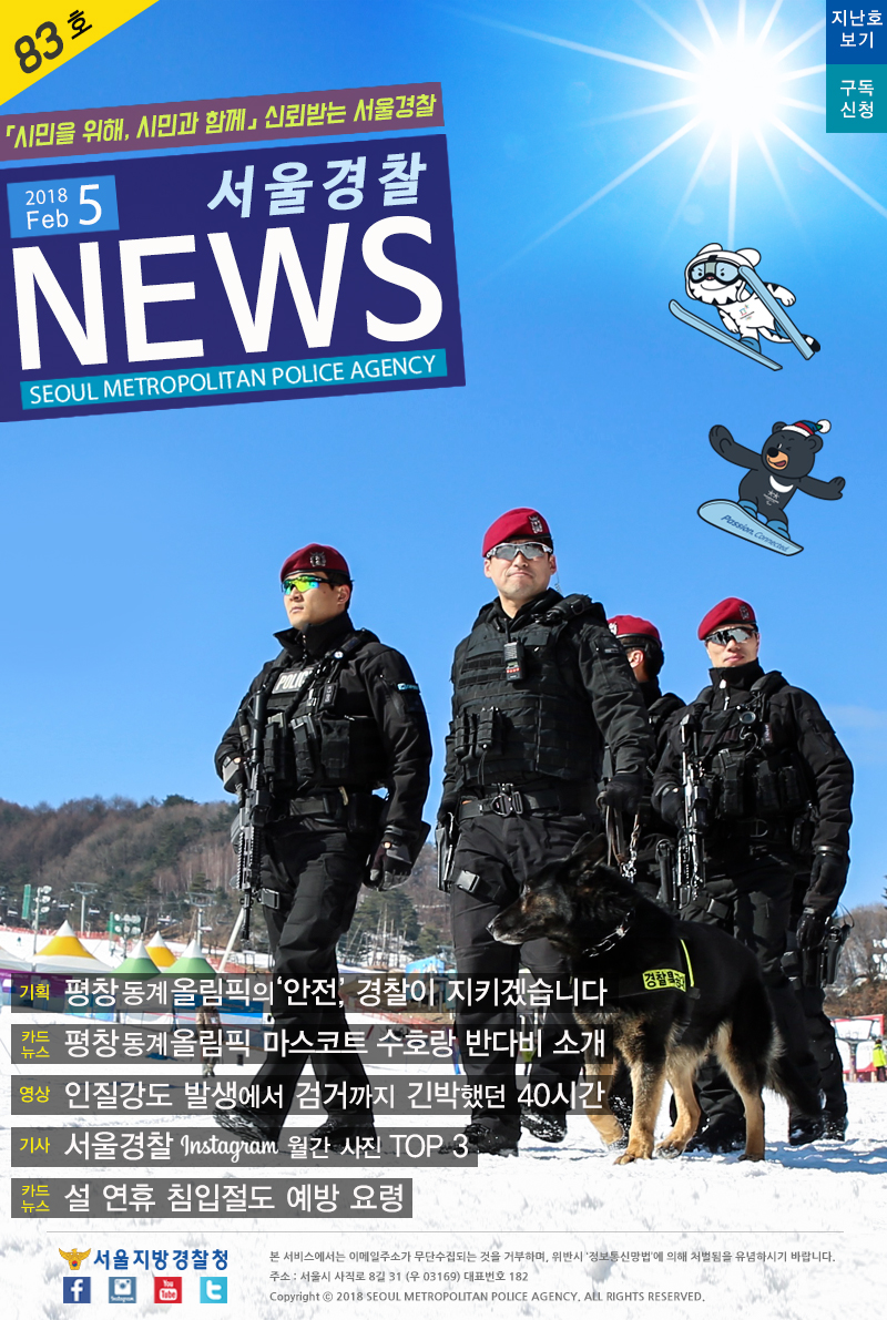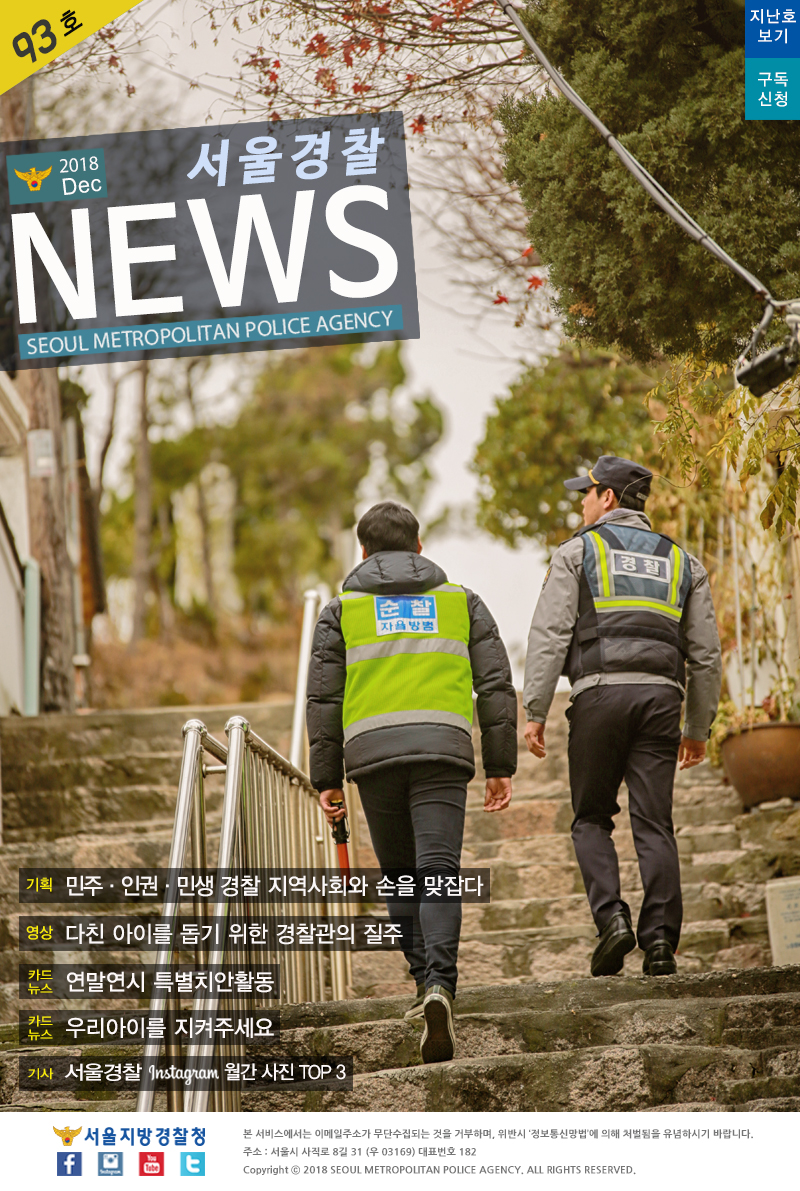 서울경찰 소식지를 신청하시면 최신 소식을 이메일로 받아보실 수 있습니다. 서울경찰청의 개인정보보호정책에 따라 입력하신 메일주소는 타인(기관)에 양도되지 않을 것이며, 이용 목적 소멸 시 폐기됨을 알려드립니다.